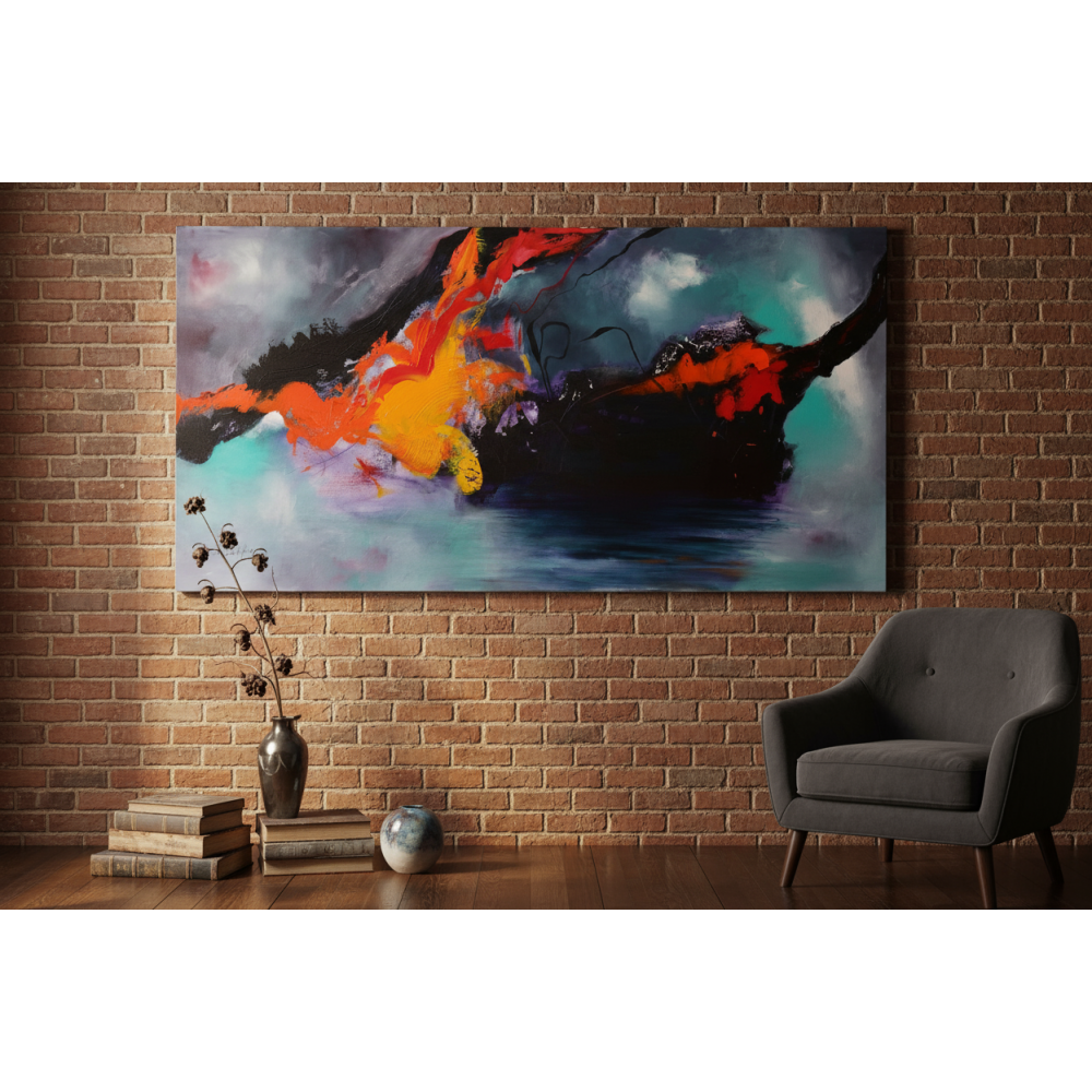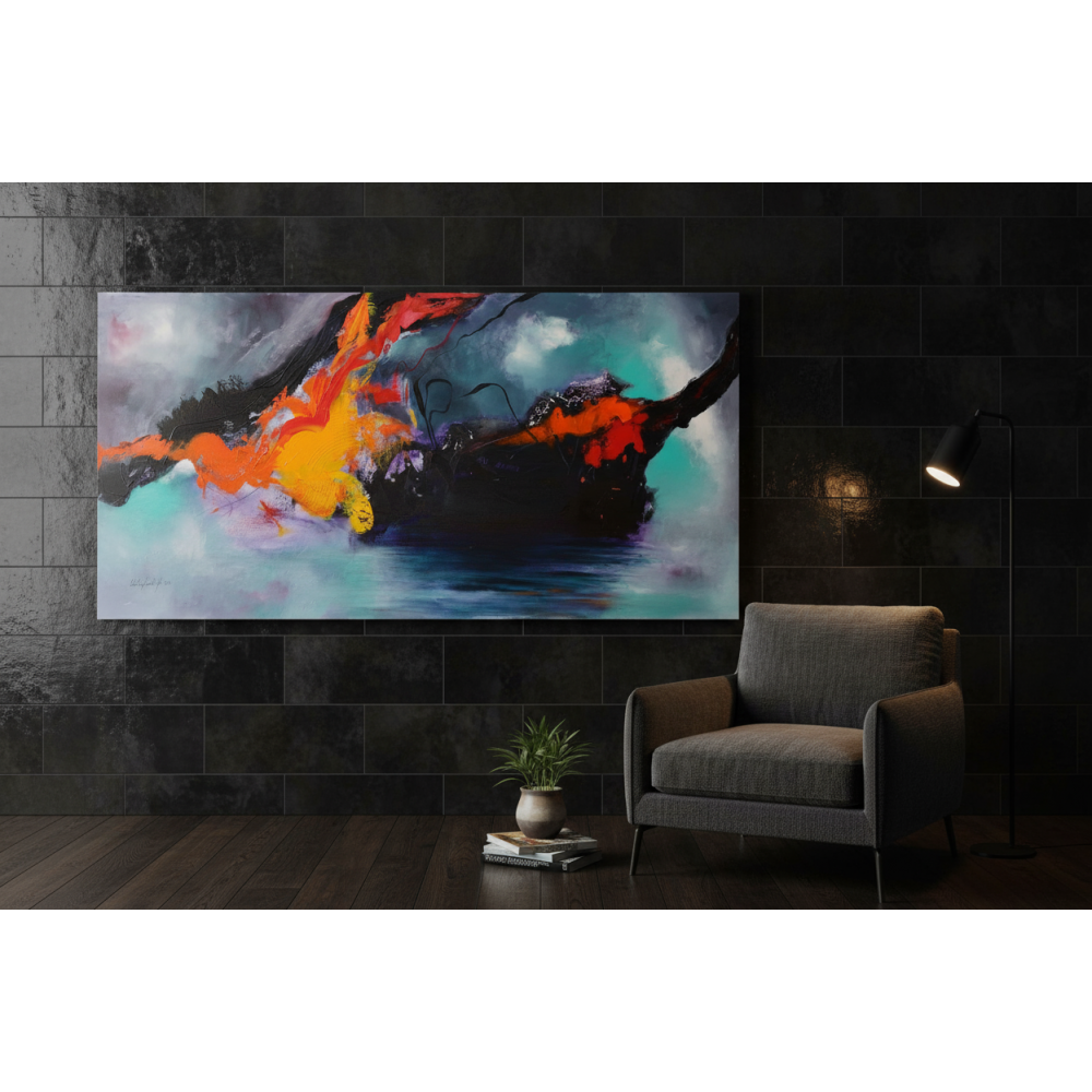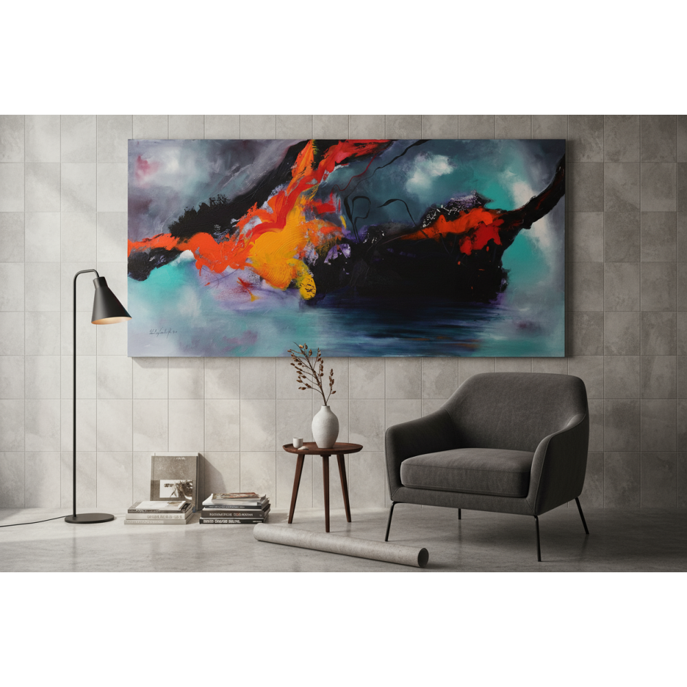 Sanatçı, doğanın enerjisini soyut bir perspektifle ele alarak su ve ateşin karşıtlığından doğan dengeli bir kompozisyon yaratır. Her fırça darbesi, kontrol ile özgürlüğün sınırında dolaşır ve izleyiciye hem güçlü bir hareket duygusu hem de derin bir içsel sükûnet sunar.