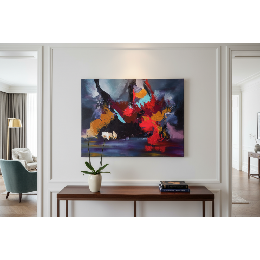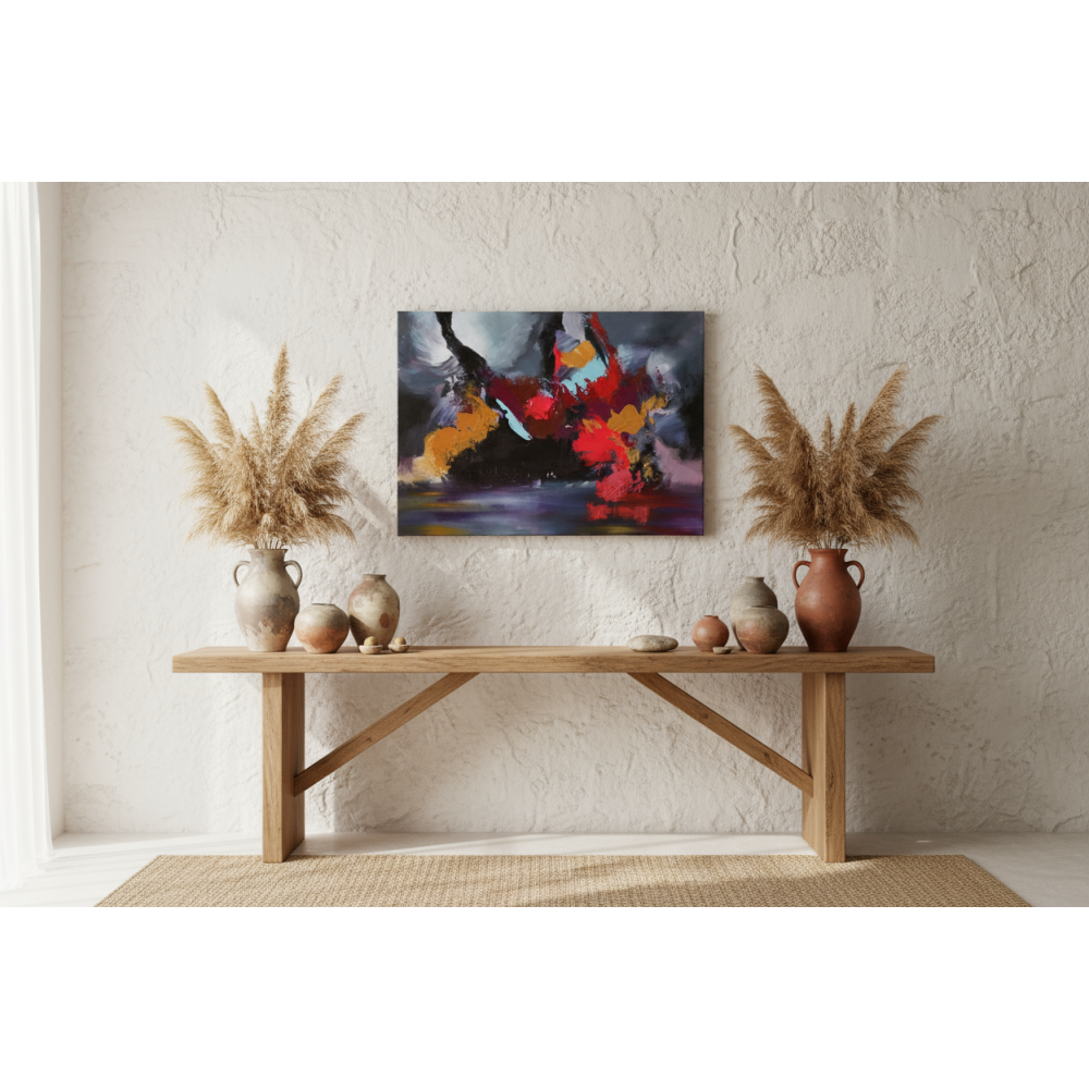 Sanatçı, enerjinin sınır tanımadığı bir ânı bu eserde dondurur. Fırça darbeleri, bir patlamanın hemen ardından gelen sessizliği hissettirir; izleyiciye hem gerginlik hem de dinginlik arasında gidip gelen bir atmosfer sunar.